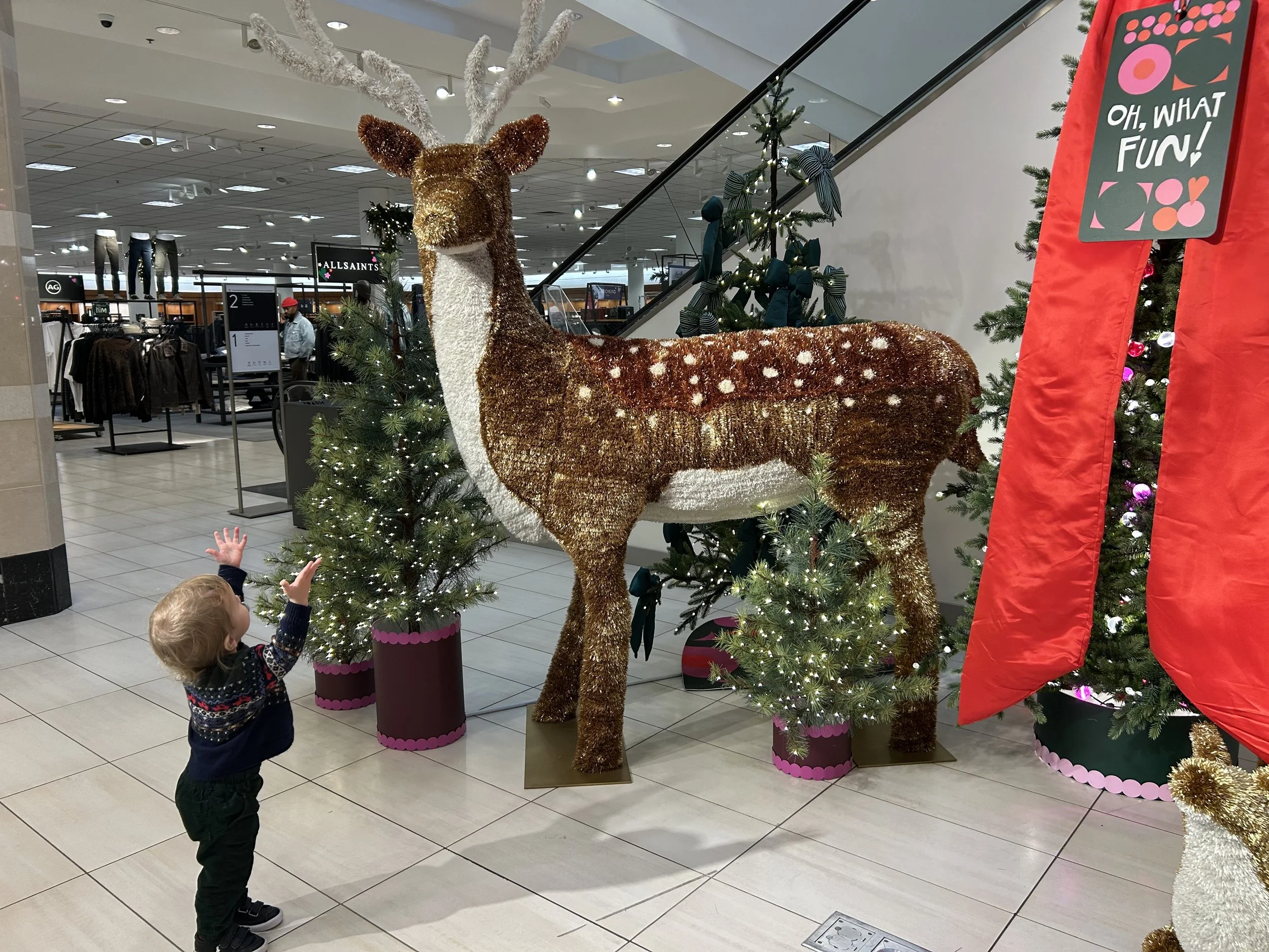 I delighted in watching August discover larger than life Reindeer in a department store. I sat down and wrote letters to Santa with Norah and then later watched Santa wave at Norah and give a jolly, “Ho-Ho-Ho,” to her that echoed through the corridors. Before leaving, I stopped at the food court and ordered a Philly Cheesesteak Sandwich, to be matched with an Auntie Anne’s pretzel. Like the halo in the pretzel maker’s logo, it was heavenly.